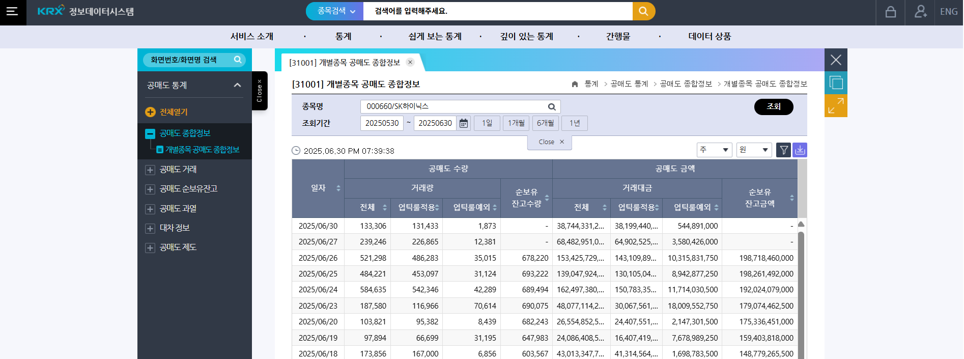 - 종목 검색 및 확인: 우측 상단의 검색창에 내가 보유한 종목명(예: SK하이닉스)을 입력하고 조회 버튼을 누릅니다. 그러면 해당 종목의 일자별 공매도 거래량, 거래대금과 함께 가장 중요한 '공매도 잔고 수량' 및 '공매도 잔고 금액'을 확인할 수 있습니다. '공매도 잔고'란, 아직 갚지 않고 남아있는 공매도 물량 전체를 의미합니다.